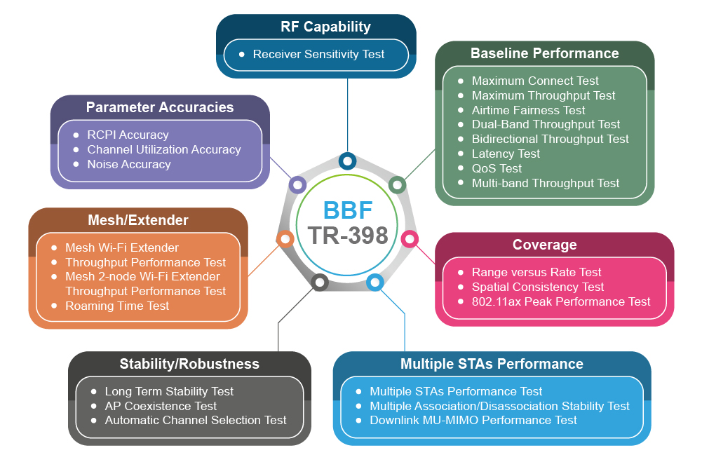 The benchmarking follows the BBF TR-398 standard, a globally recognized specification for assessing in-home wireless router performance, including RF capability, coverage, parameter reporting accuracy, and stability.