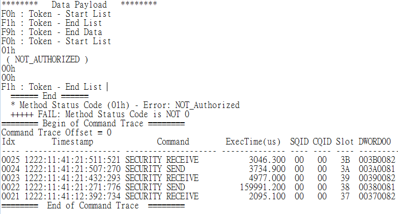 Next, to verify whether the Opal Protocol implementation complies with the TCG specifications (TCG Storage Architecture Core Specification, Version 2.01; TCG Storage OPAL Test Cases Specification, Version 1.00), protocol tests are performed to conduct functional checks on the storage device. These tests validate whether the protocol responses fully comply with the specifications.
